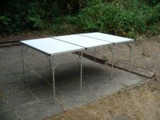 Dieses 3 tlg. Tische Set besteht aus: 2 Einzeltischen mit einklappbaren Füßen und einer Einlegeplatte ohne Füße um dazwischen einzuhängen.