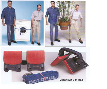 Der Transport von schwer zu Greifenden Lasten wie z.B. Kühlschränke, Waschmaschienen, Möbel, große Blumenkübel usw. wird mit Octopus sehr vereinfacht. Insbesondere auch der Transport über Treppenstufen.